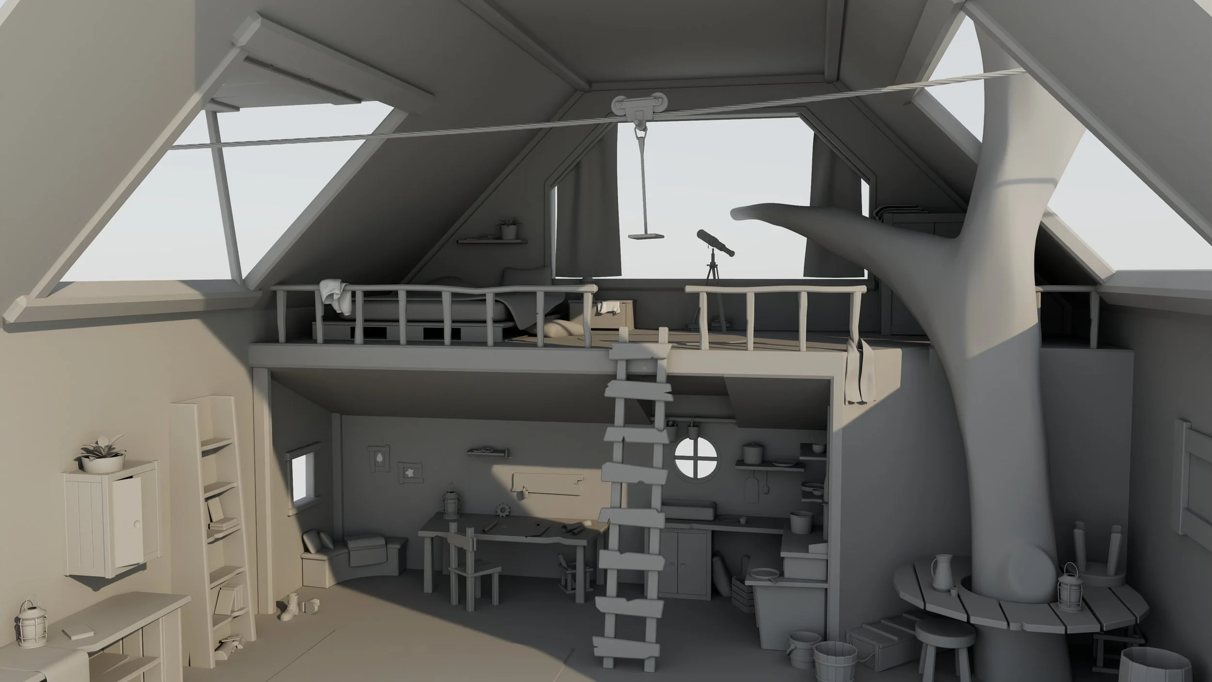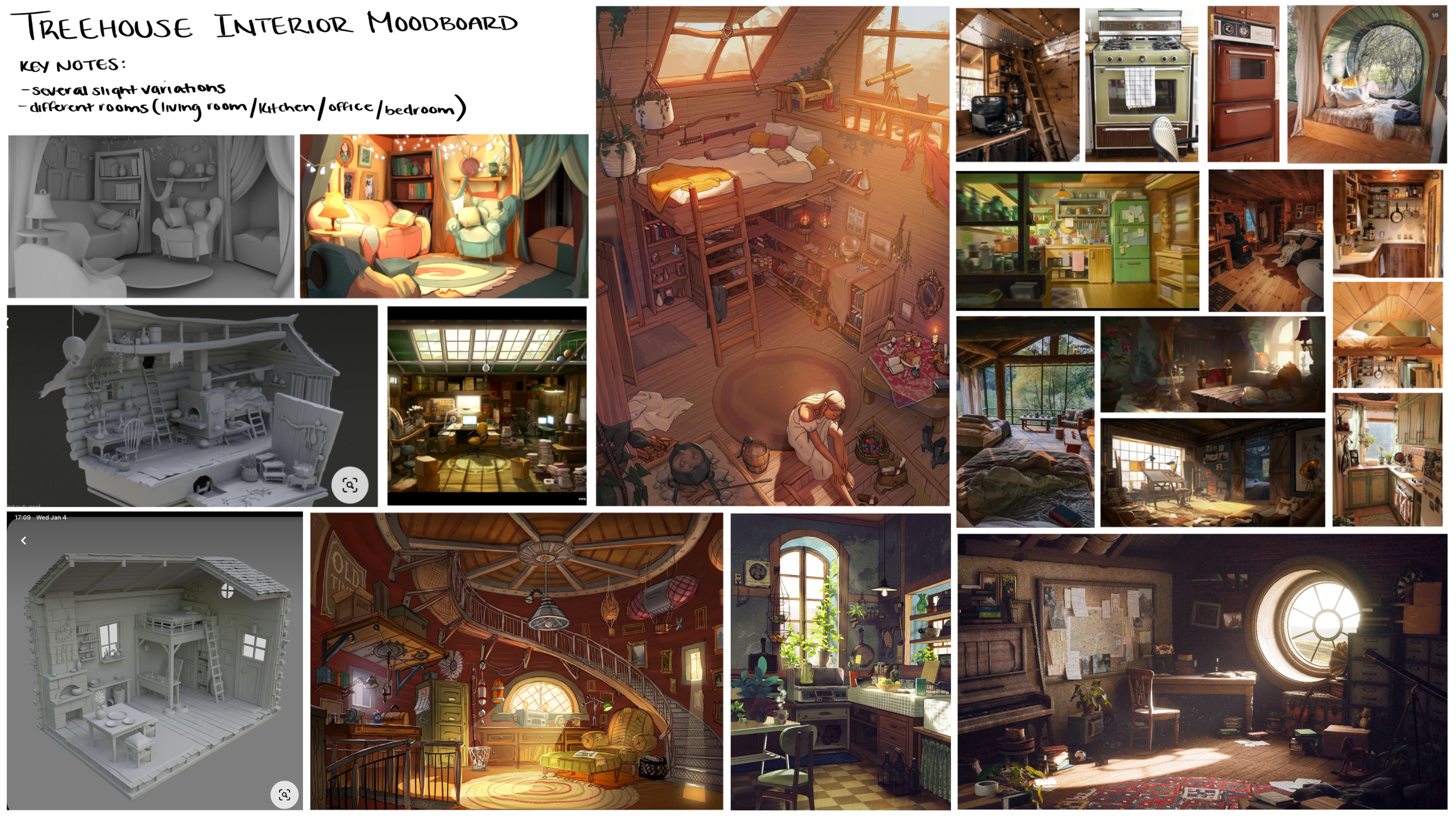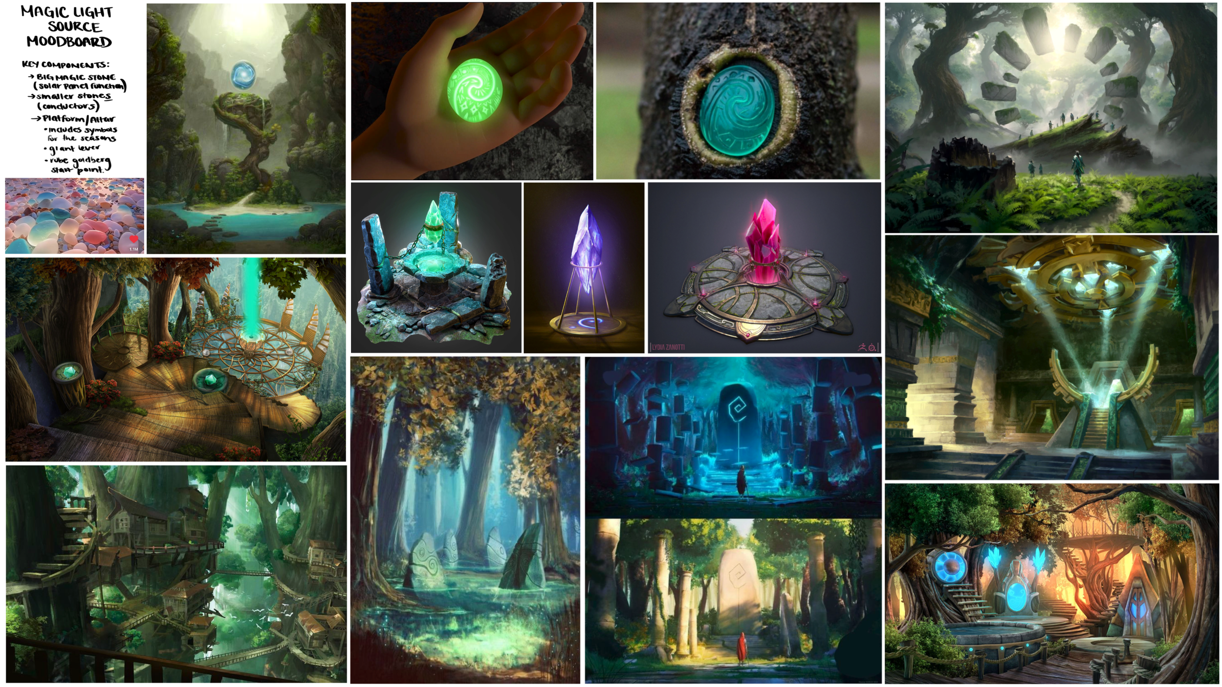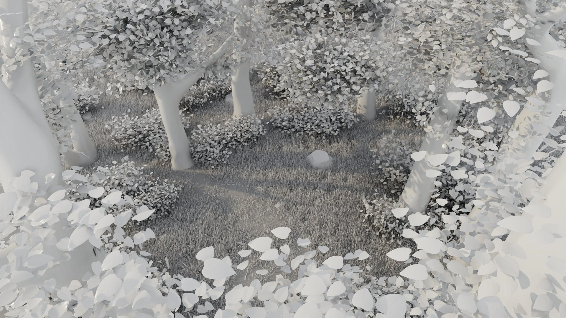 The forest environment made it necessary to have a variety of layouts to account for the characters moving through the space. The placement of the trees and foliage helped force perspective and draw focal points in each scene.