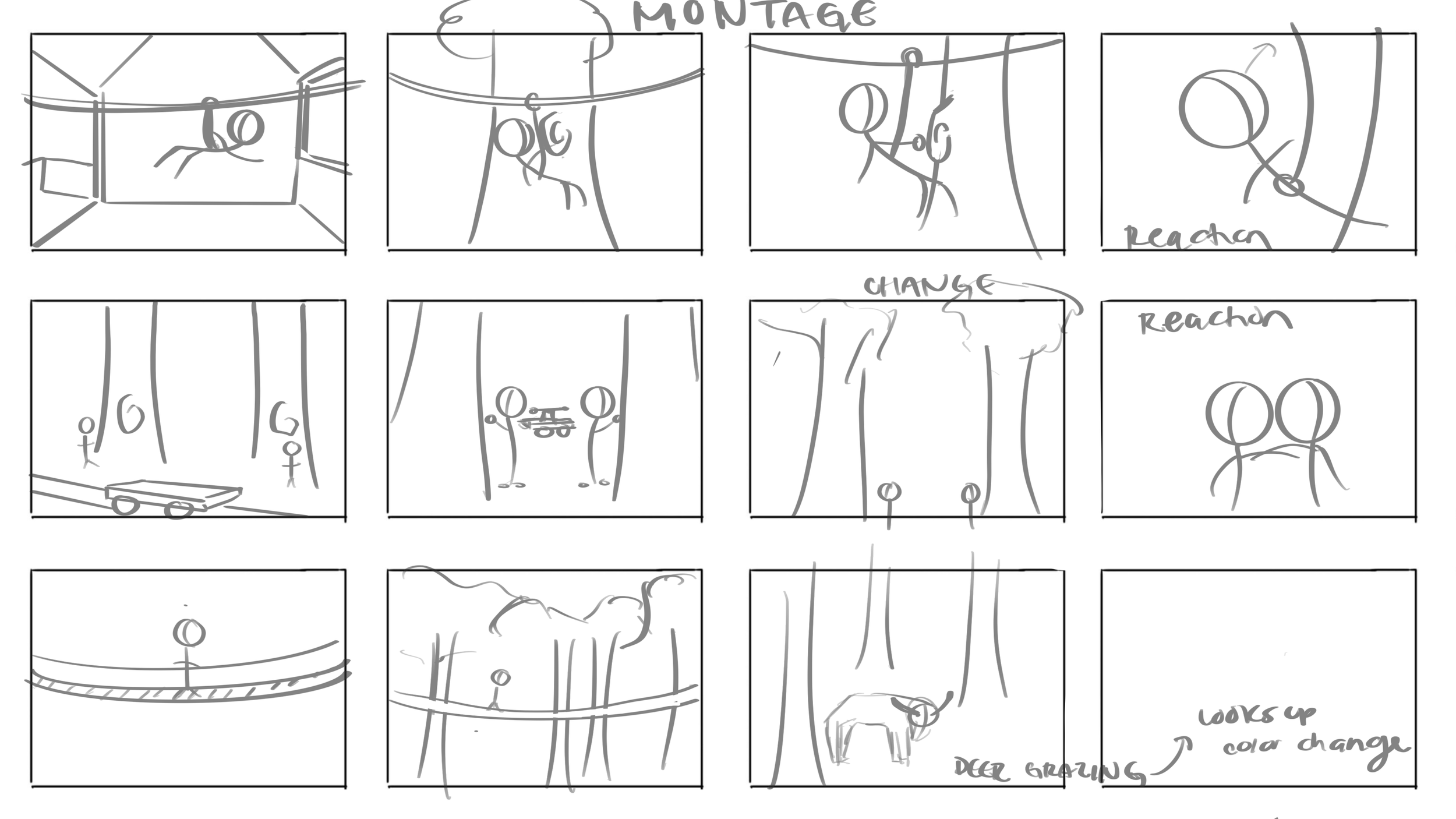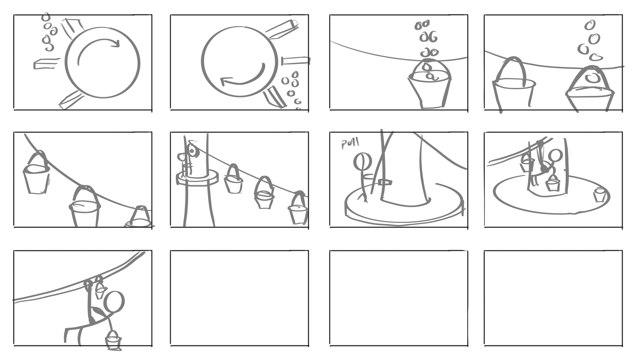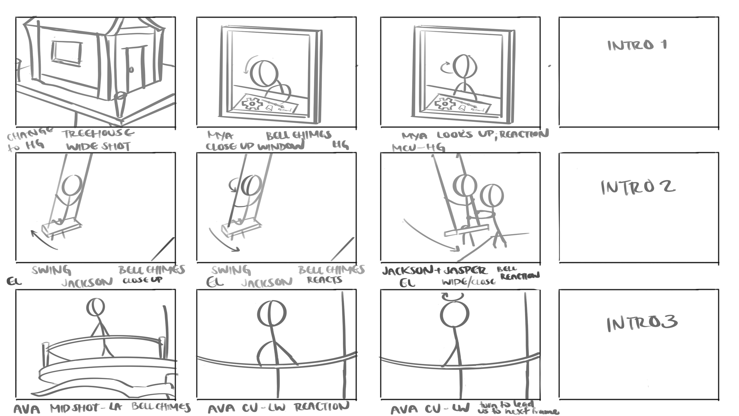 The story went through several iterations. Here are some early thumbnail sketches and the first version of the animatic and script.