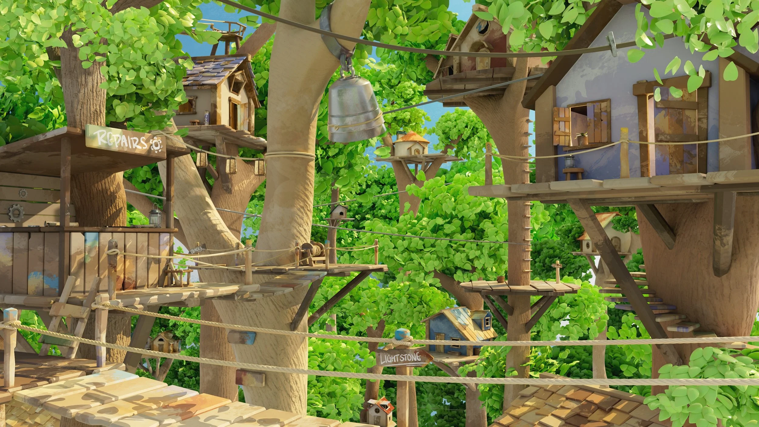 The story takes place in a forest with latent magic. There is a village of treehouses high up amongst the treetops.